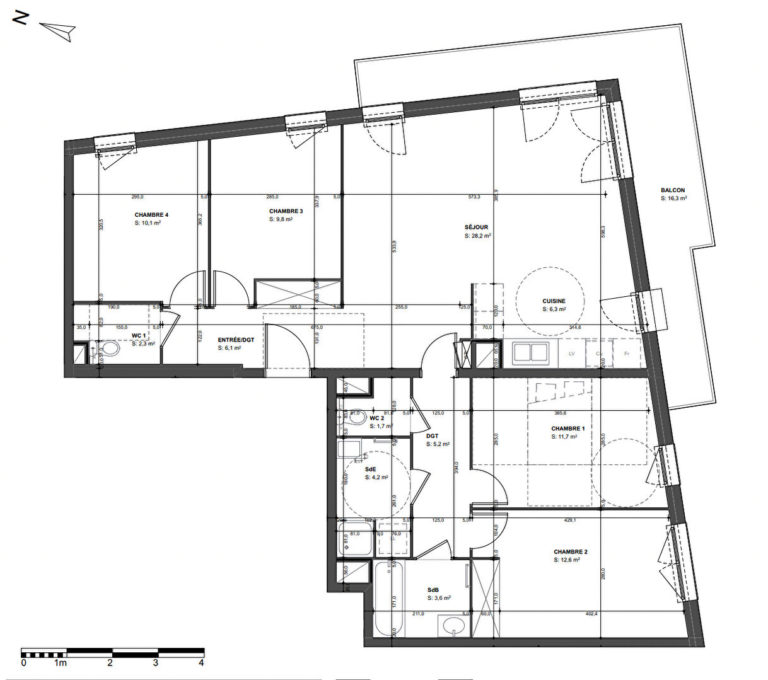 Cet appartement traversant, en parfait état vous offre une entrée avec rangements, un séjour de 34,50 m2 ouvrant sur un balcon de 16 m2 qui profite d’une double exposition Est/ Ouest, une cuisine US équipée, quatre chambres profitants de rangements, une salle de bains, une buanderie (poss seconde salle de bains) et un WC indépendant.